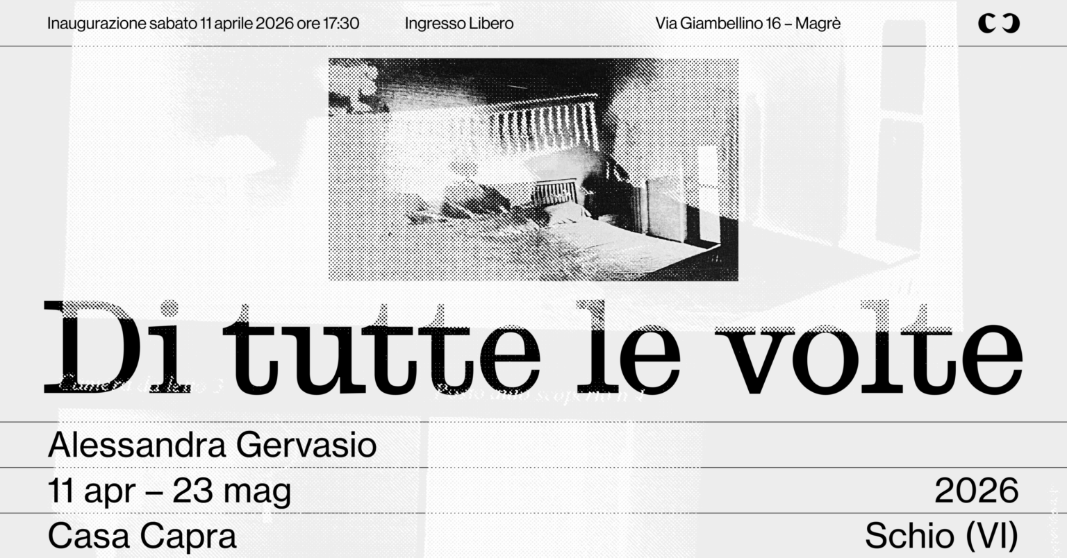 Casa Capra di Schio è lieta di annunciare l’inaugurazione di Di tutte le volte, mostra personale di Alessandra Gervasio a cura di Piero Martinello. L’esposizione apre sabato 11 aprile 2026 alle ore 17:30 e resterà visitabile fino al 23 maggio 2026 presso gli spazi di Casa Capra, in Via Giambellino 16 – Magrè, Schio (VI). L’ingresso è libero.In questa occasione verrà presentato il volume edito da Skinnerboox. Verrà inoltre presentato il secondo fascicolo delle Edizioni di Casa Capra con un testo di accompagnamento di Rica Cerbarano.